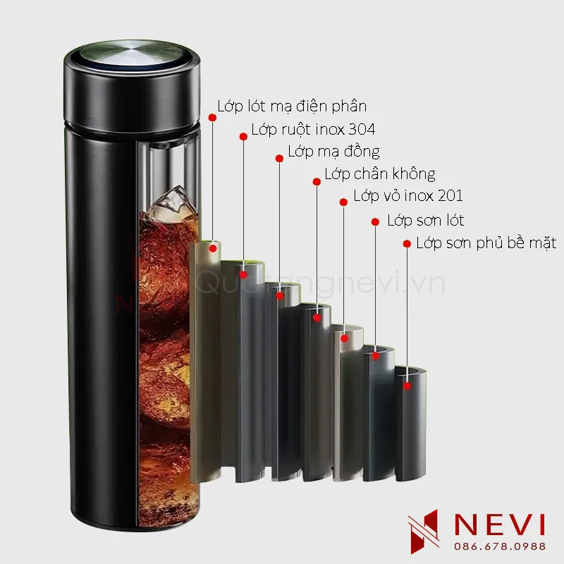 - Bình được cấu tạo cách nhiệt 7 lớp: vật liệu chính là lớp vỏ inox 201 và lớp ruột inox 304 cho kết cấu bình bền chắc, chống va đập cực tốt, tuổi thọ sử dụng lâu dài, vật liệu không gỉ, không chứa chất BPA, không gây mùi khó chịu, cấp an toàn thực phẩm giúp bảo vệ sức khỏe người sử dụng.