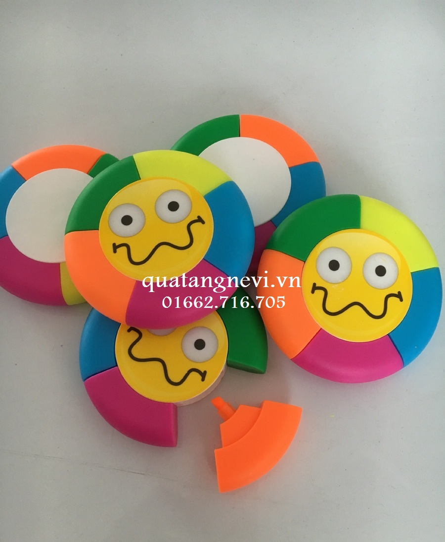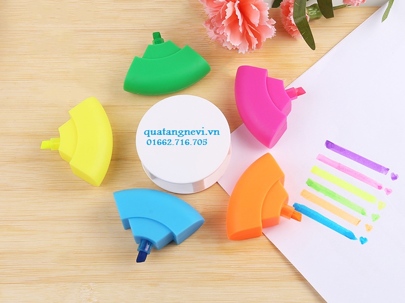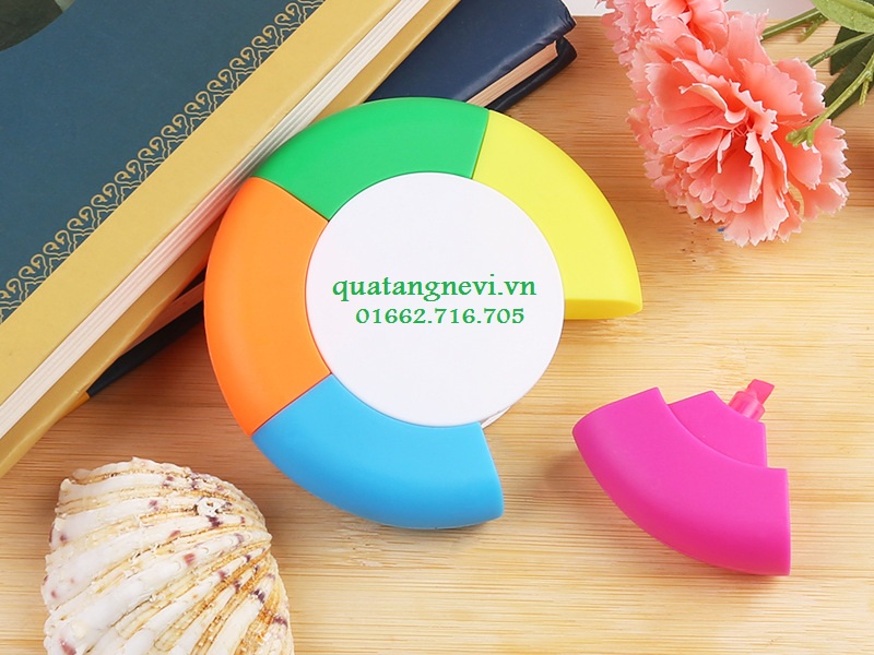 Mẫu bút highlight,bút nhớ dòng hình bánh xe 5 màu .Bút highlight,bút nhớ dòng thường được in logo, thông tin, thông điệp để dành tặng cho học sinh,học viên,sinh viên, nhân viên văn phòng...