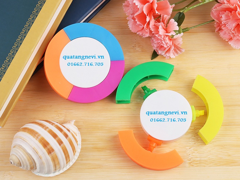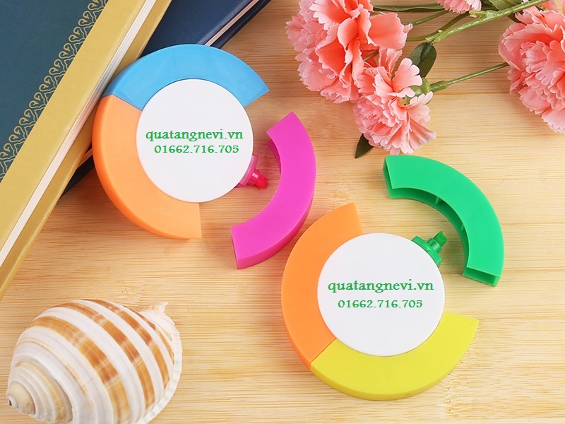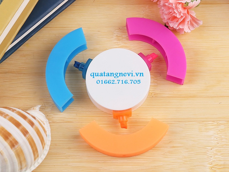Mẫu bút highlight,bút nhớ dòng hình bánh xe 3 màu .Bút highlight,bút nhớ dòng thường được in logo, thông tin, thông điệp để dành tặng cho học sinh,học viên,sinh viên, nhân viên văn phòng...
